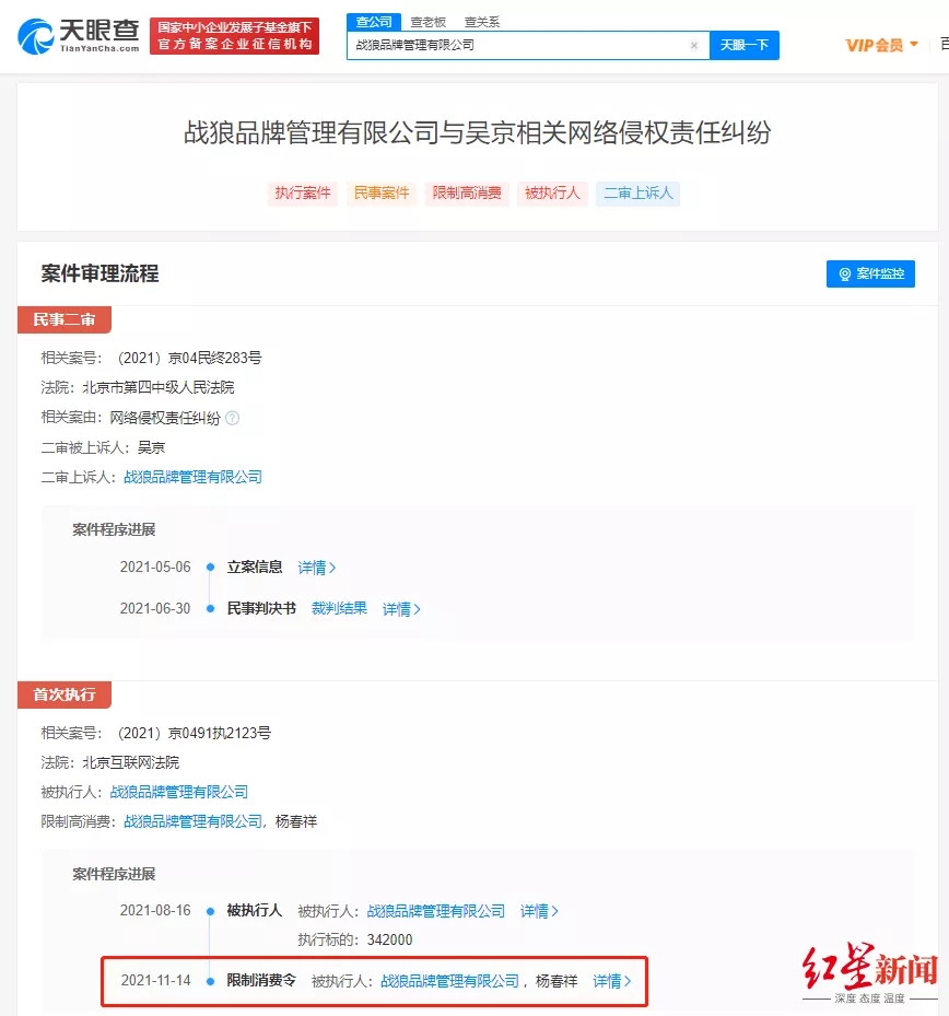 据天眼查App显示,战狼品牌管理有限公司(以下简称“战狼公司”)近日新增一则限制消费令,限制消费对象为该公司及其法定代表人杨春祥,申请人为吴京,其关联案件为该公司与吴京相关网络侵权责任纠纷。