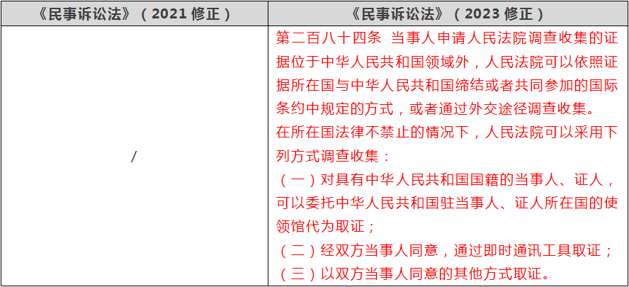 丰富域外调查取证方式,完善司法协助制度依据现行《民事诉讼法》,法院主要基于我国缔结或者参加的国际条约(如《关于从国外调取民事或商事证据的公约》)、双边民事司法协助条约,或者按照互惠原则进行域外调查取证。因程序流转繁琐,域外调查取证通常耗时较长,存在较多障碍。新《民事诉讼法》在保留上述途径的基础上,进一步规定,在证据所在国法律不禁止的情况下,法院可以委托中国驻当事人、证人所在国的使领馆代为取证,或者经双方当事人同意,通过即时通讯工具或其他方式取证。这一修改使得法院域外调查取证的方式更为灵活、便捷、丰富、高效,且有利于提高法院域外调查取证的积极性,进而提升案件审判的公正性。